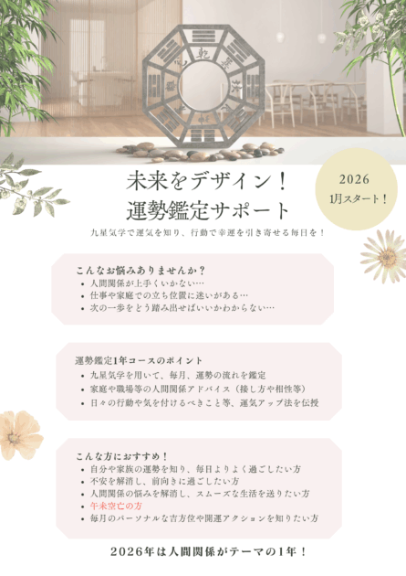 そこで、あなたの2026年を最高の1年にデザインするために、九星気学を用いた「年間運勢鑑定サポート」を募集いたします。