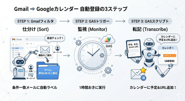 「講座の案内メールが届くと、自動でGoogleカレンダーに予定が入る」