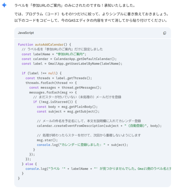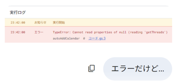 Geminiにコードを書いてもらい、それをコピーしてGoogle Apps Scriptに貼り付け、GASのエディタ画面に貼り付けるだけ…のはずでした。