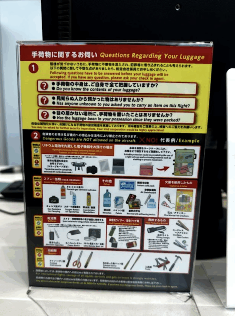 東京に戻る際、手荷物検査場で見つけたという「持ち込み禁止品」の札を写真に撮って送ってくれたのです。彼曰く