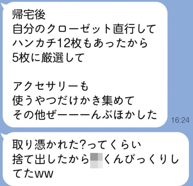 CD、パーカー、お弁当箱、そしてお気に入りの古くなった水筒まで、次々と処分したと報告してくれました。