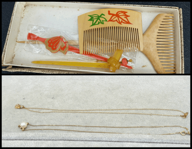 (上)和装用の櫛やかんざしは、おまとめ10円。(>_<) べっこうっぽいのですが、鑑定されず、おまとめ価格。