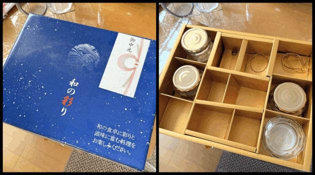 「御中元」の箱をワクワクして開けてみると、中は沢山の空き瓶…「空き箱、空き瓶は再利用するべき」との思い込み。使わないのに残している母。(* v v)