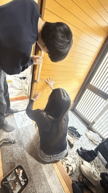 まず、作業開始早々、孫たちが玄関に手すりを付けてくれました。