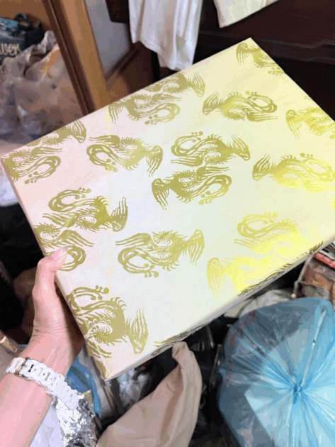 とおもいきや、奥に仕舞い込みすぎて忘れ去られていたものも。上の画像は、今治タオルが入った箱。包装紙にはシミがつき、中のタオルにもシミが。長い間押し入れの奥底にあったので、傷んでしまっていました。