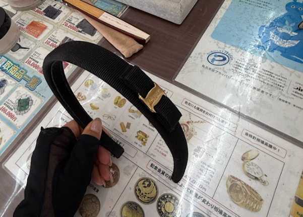 写真は妹がプレゼントしたフェラガモのカチューシャ。使われず仕舞い込まれていたので内側は傷んでいます。エコリングの買取価格は1,000円。