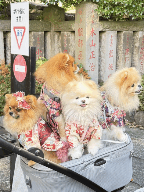なんと、可愛いワンちゃんたちが、七五三の晴れ着を着て参拝に来ていたんです!飼い主さんと一緒に記念撮影をする姿は、本当に愛らしくて、思わず笑顔になってしまいました。(撮影許可、いただいております)